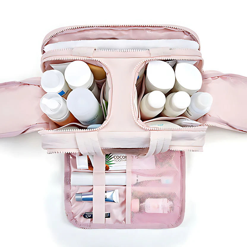 Der Kulturbeutel hat 4 geräumige Fächer – zwei Hauptbereiche und zwei Taschen mit Reißverschluss – inklusive extra Slots für Pinsel, Flaschen und mehr.